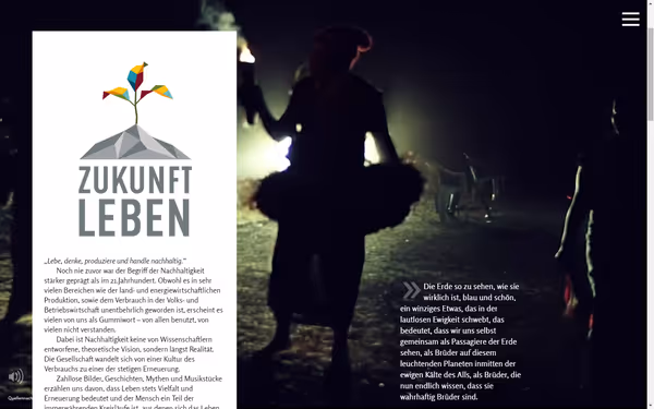 Zukunft Leben lässt uns auf sinnliche Weise erfahren, was Nachhaltigkeit bedeutet. Ergänzend zum gleichnamigen Hörbuch des Silberfuchs-Verlags entsteht hier eine neue Form digitalen Magazins. Dem Besucher wird das Thema Nachhaltigkeit ansprechend und niedrigschwellig mit Hilfe formatfüllender Bilder, Animationsvideos und interaktiven Inhalten nahegebracht.